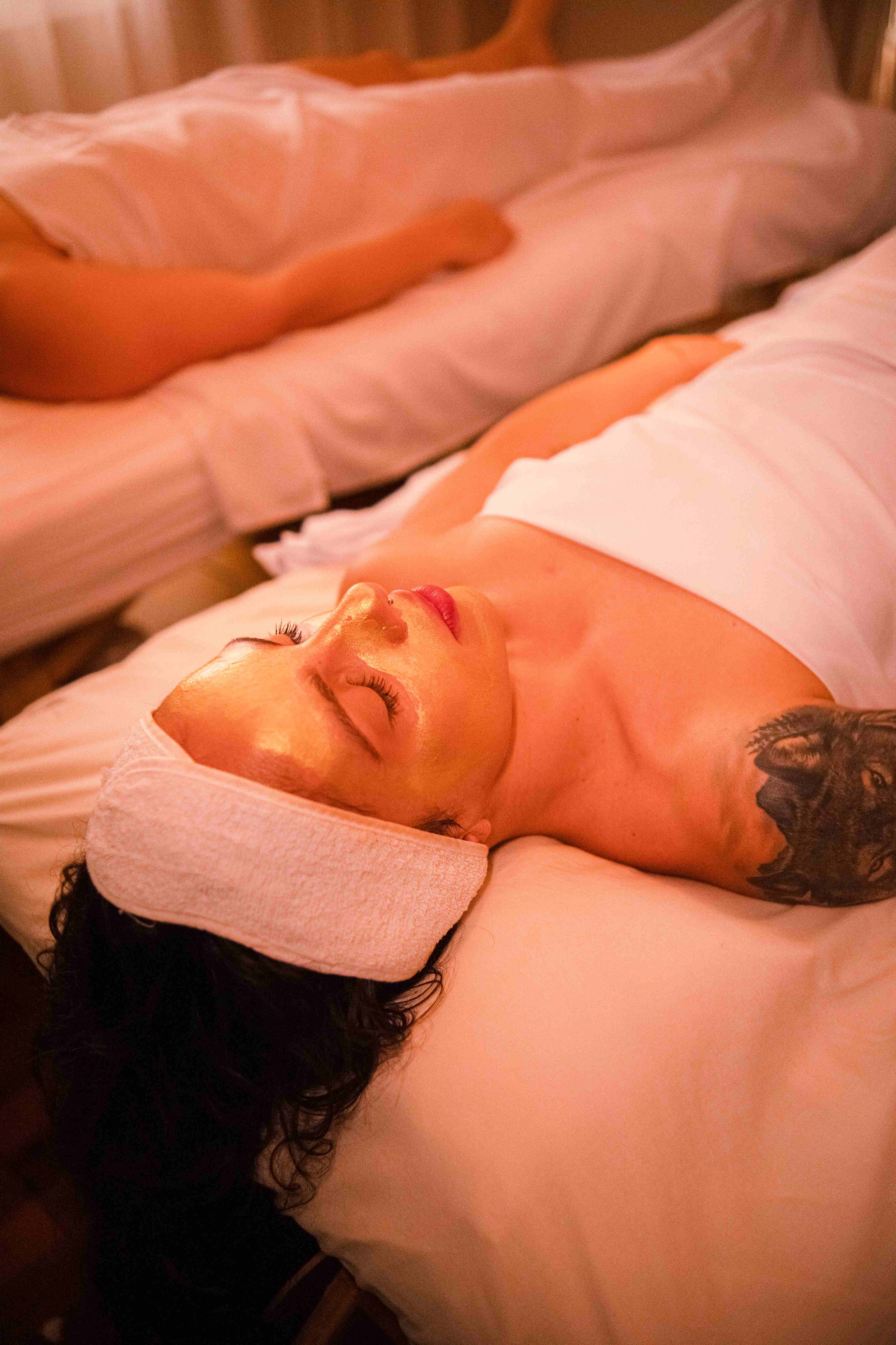 Escalda-pés • Reflexologia • Massagem Facial • Massagem Relaxante corporal • Massagem Terapêutica nas costas • Lanche personalizado • Brinde com espumante